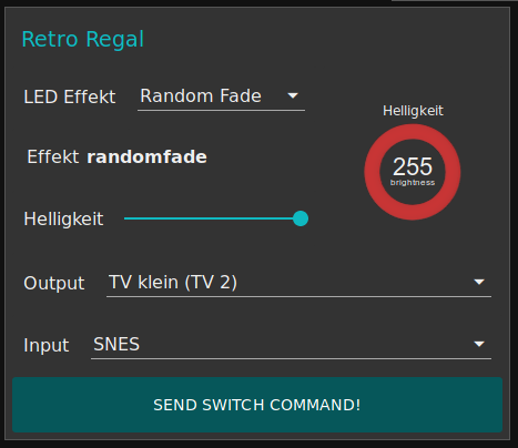 Das Webinterface bietet eine etwas ansprechendere Konfigurationsmöglichkeit für das Regal. Im Kasten „Retro-Regal“ kann alles relevante konfiguriert werden. Die Gerätebezeichnungen sind ggf. nicht aktuell, bspw. ist der Beamer derzeit dort noch nicht auswählbar, aber grundsätzlich kann eine Quelle und eine Ausgabe gewählt werden und mittels „SEND SWITCH COMMAND!“ gesetzt werden. So können auch mehrfache Konfigurationen nacheinander ausgeführt werden, die sich akkumulieren. Alle anderen Kommandos werden instantan ausgeführt, z.B. die Effekte, die die LEDs betreffen, also Helligkeit oder Effekte. Die Effekte sind soweit selbsterklärend und werden ggf. nach und nach erweitert. Wenn hier Bugs auffallen, dann bitte an Starcalc oder Fisch.